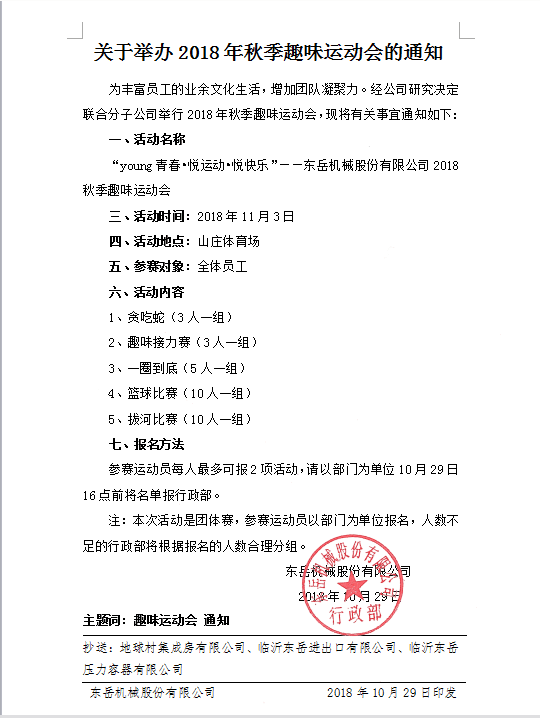 東岳機(jī)械關(guān)于舉辦2018秋季趣味運(yùn)動(dòng)會(huì)的通知